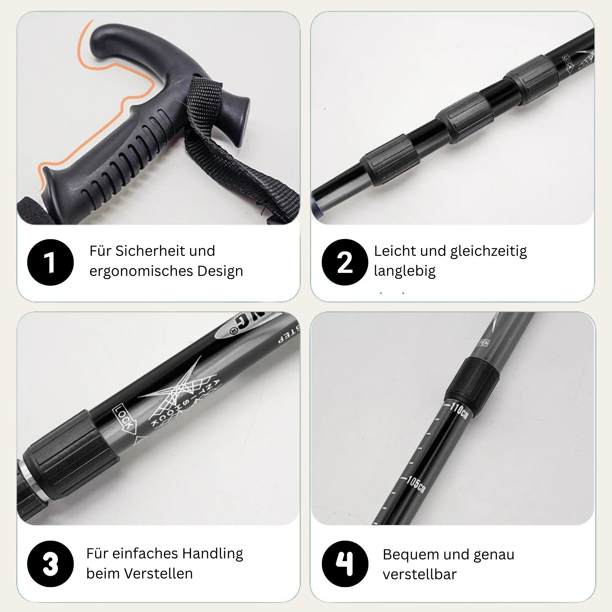 Gefertigt aus Aluminiumlegierung mit starker Stahlspitze und 3-in-1-Verriegelungssystem, bietet dieser Wanderstock hohe Stabilität bei geringem Gewicht. Durch das 4-teilige Falt-Design passt er problemlos in jeden Rucksack und ist im Handumdrehen einsatzbereit.